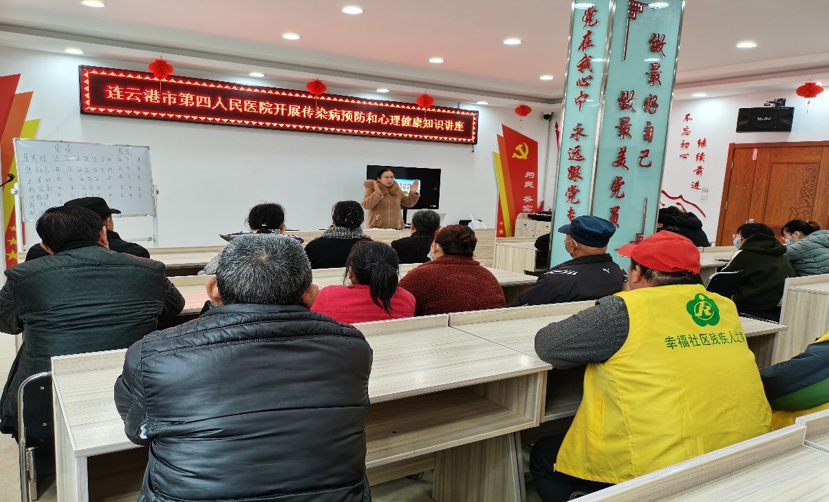 2020年11月25日下午,市护理学会传染病护理专委会在陈玉芹主委的带领下,部分委员到幸福社区的党群服务中心,开展了传染病科普与心理健康知识讲座以及义诊活动,幸福社区40多位老人以及社区工作人员前来参加。活动中首先由主委陈玉芹,给广大老年人进行题为《常见传染病的科普与预防》的专题讲座,简要介绍了常见传染病的病因、症状和预防知识,陈主任生动的讲解,引起阵阵热烈的掌声。